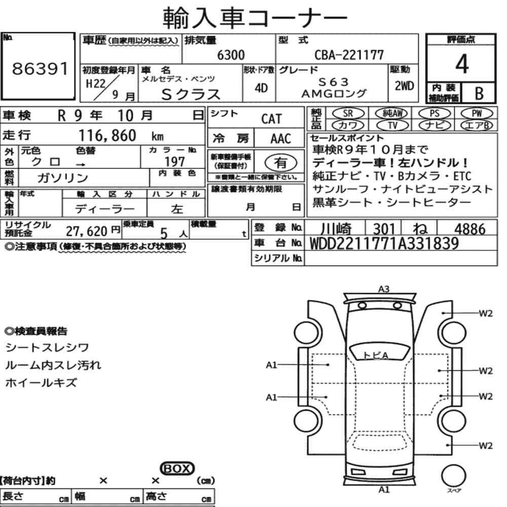 Szczegółowa analiza stanu pojazdu przeprowadzona przez japońskich ekspertów. Sprawdź oznaczenia uszkodzeń poniżej.