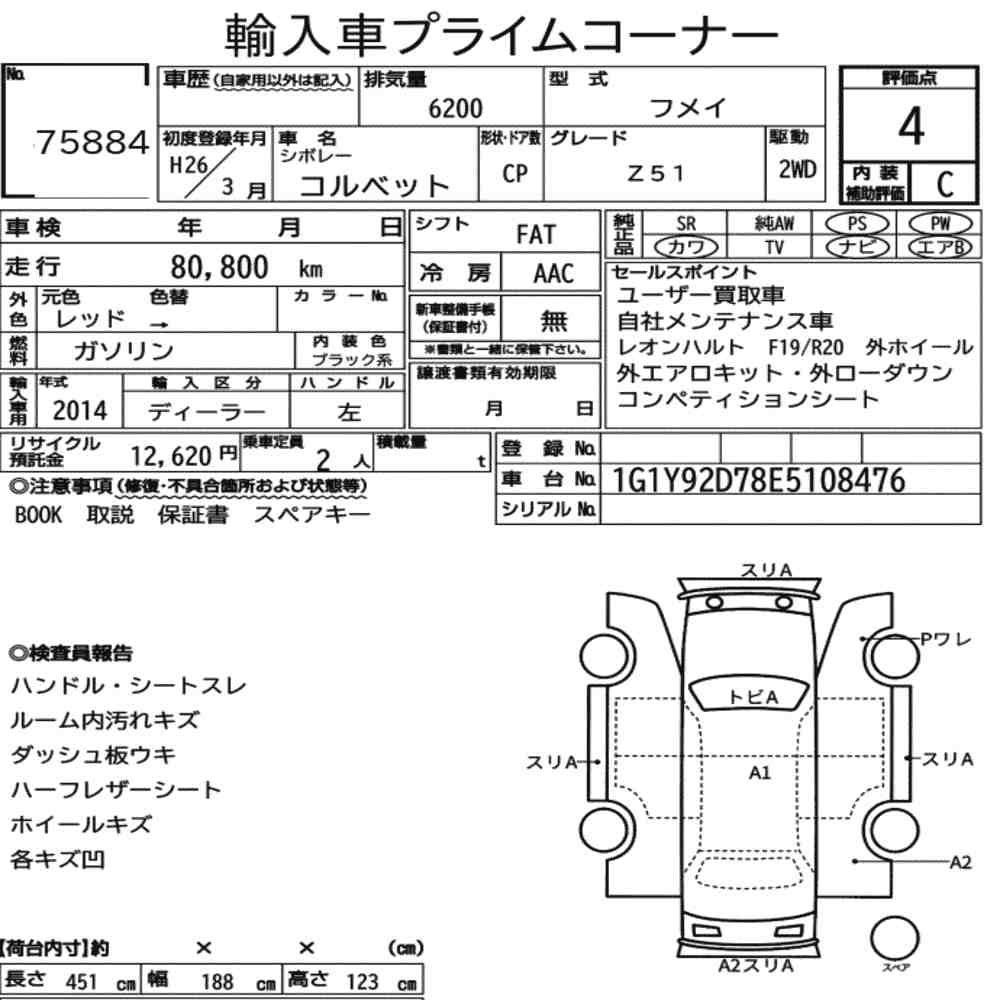 Szczegółowa analiza stanu pojazdu przeprowadzona przez japońskich ekspertów. Sprawdź oznaczenia uszkodzeń poniżej.