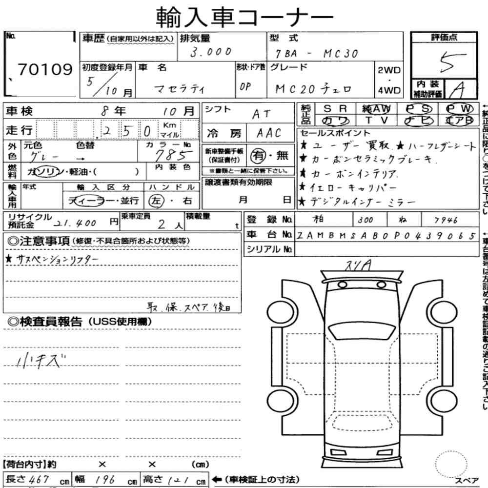 Szczegółowa analiza stanu pojazdu przeprowadzona przez japońskich ekspertów. Sprawdź oznaczenia uszkodzeń poniżej.