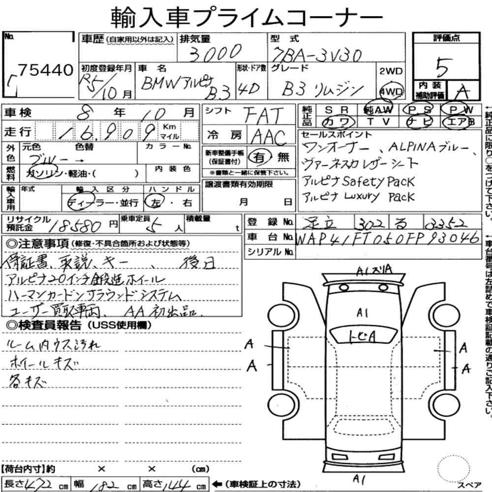 Szczegółowa analiza stanu pojazdu przeprowadzona przez japońskich ekspertów. Sprawdź oznaczenia uszkodzeń poniżej.