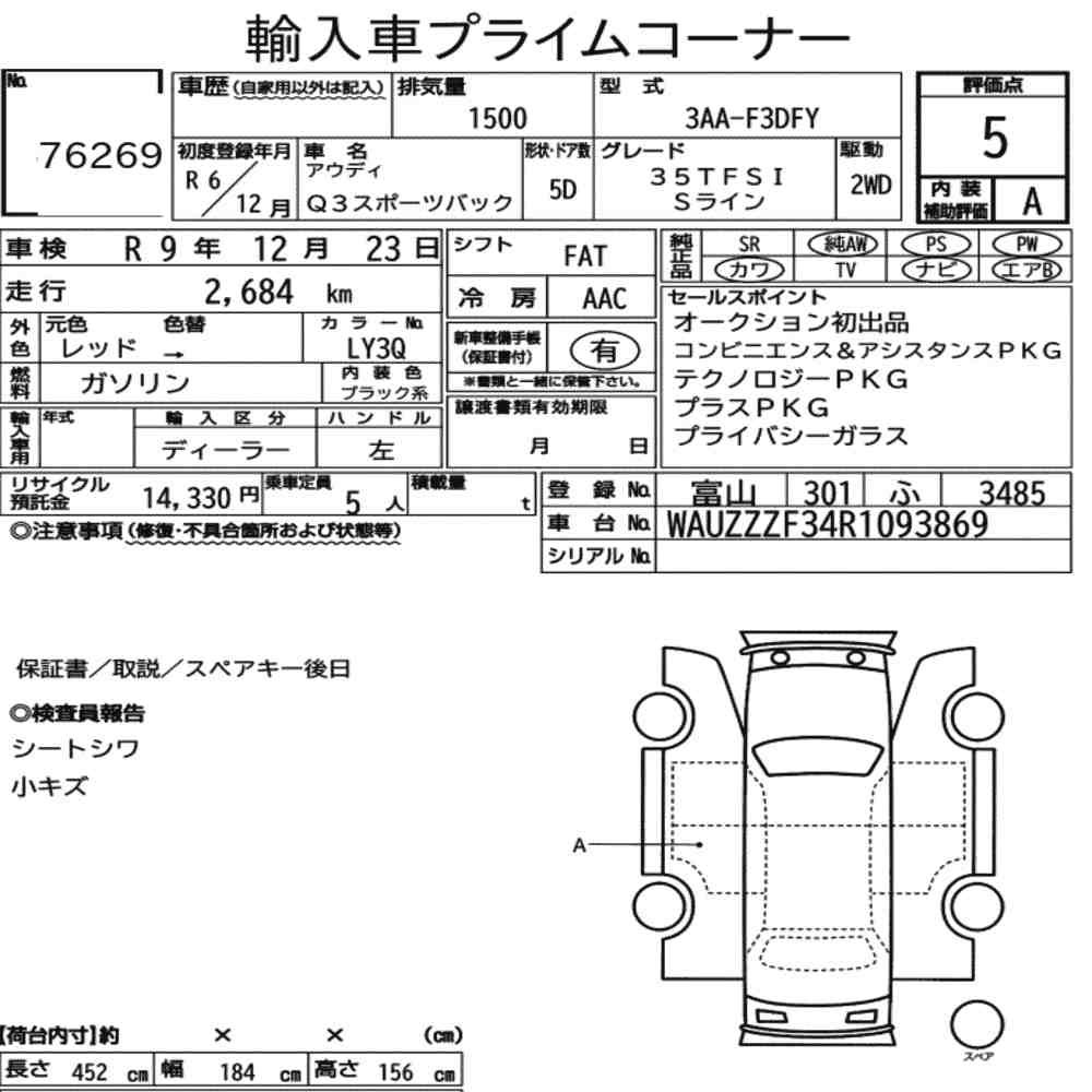 Szczegółowa analiza stanu pojazdu przeprowadzona przez japońskich ekspertów. Sprawdź oznaczenia uszkodzeń poniżej.