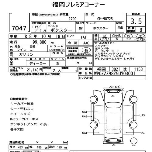 Szczegółowa analiza stanu pojazdu przeprowadzona przez japońskich ekspertów. Sprawdź oznaczenia uszkodzeń poniżej.