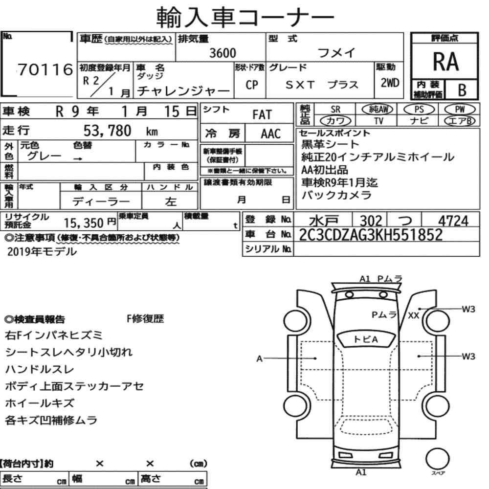 Szczegółowa analiza stanu pojazdu przeprowadzona przez japońskich ekspertów. Sprawdź oznaczenia uszkodzeń poniżej.