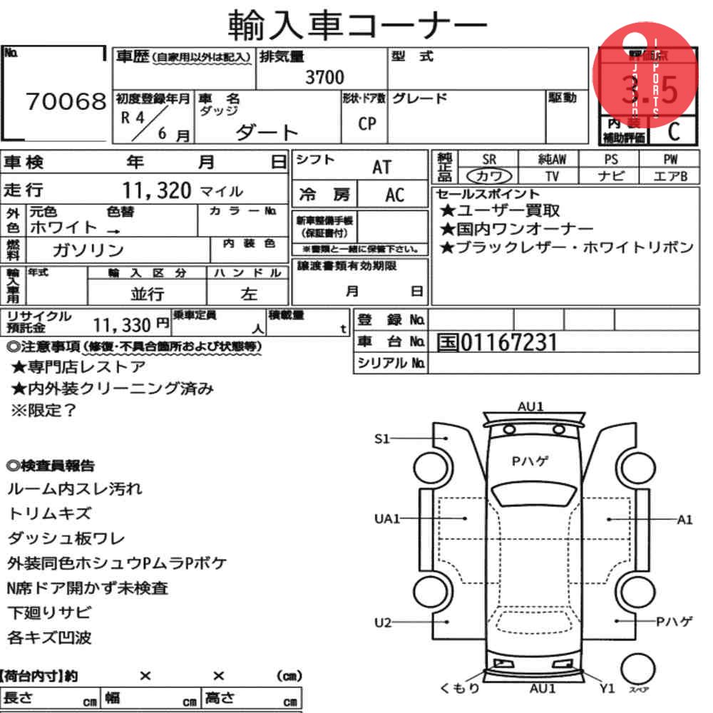 Detailed vehicle condition analysis performed by Japanese experts. Check damage codes below.
