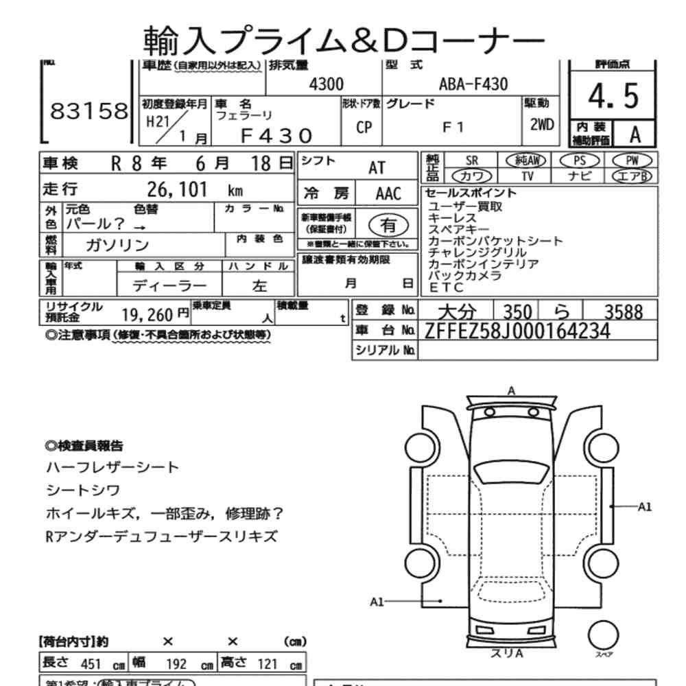 Szczegółowa analiza stanu pojazdu przeprowadzona przez japońskich ekspertów. Sprawdź oznaczenia uszkodzeń poniżej.