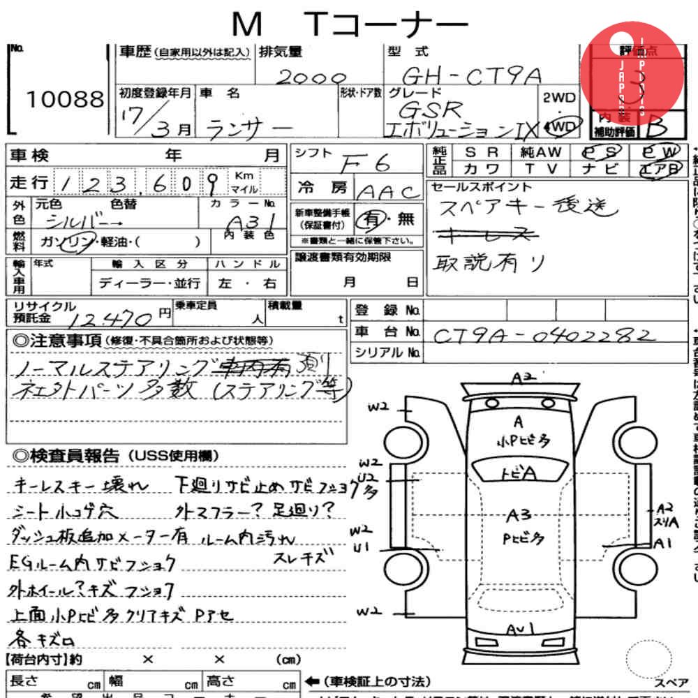 Detailed vehicle condition analysis performed by Japanese experts. Check damage codes below.