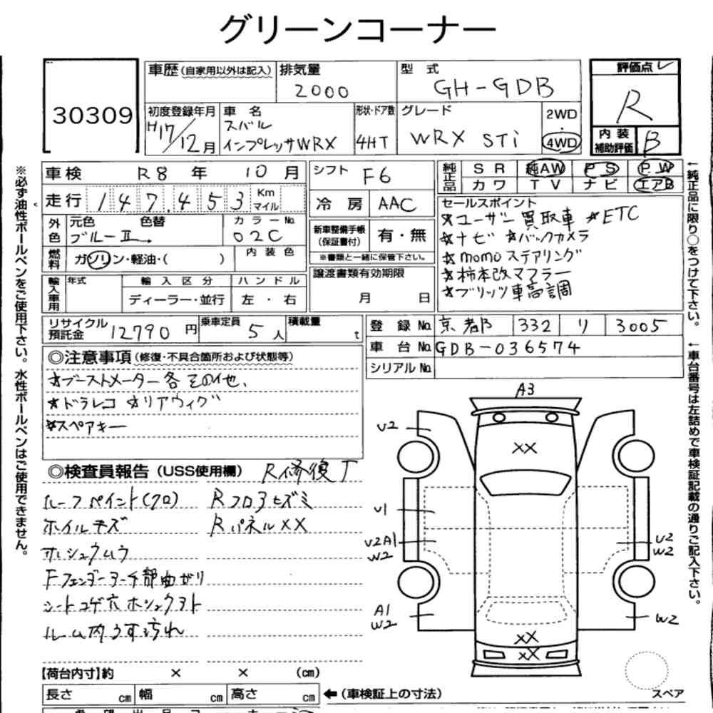Detailed vehicle condition analysis performed by Japanese experts. Check damage codes below.