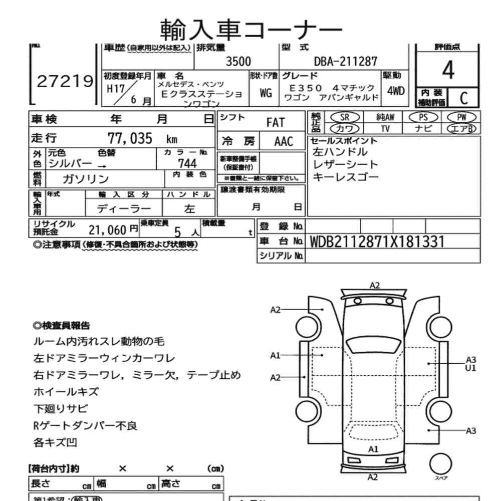 Szczegółowa analiza stanu pojazdu przeprowadzona przez japońskich ekspertów. Sprawdź oznaczenia uszkodzeń poniżej.