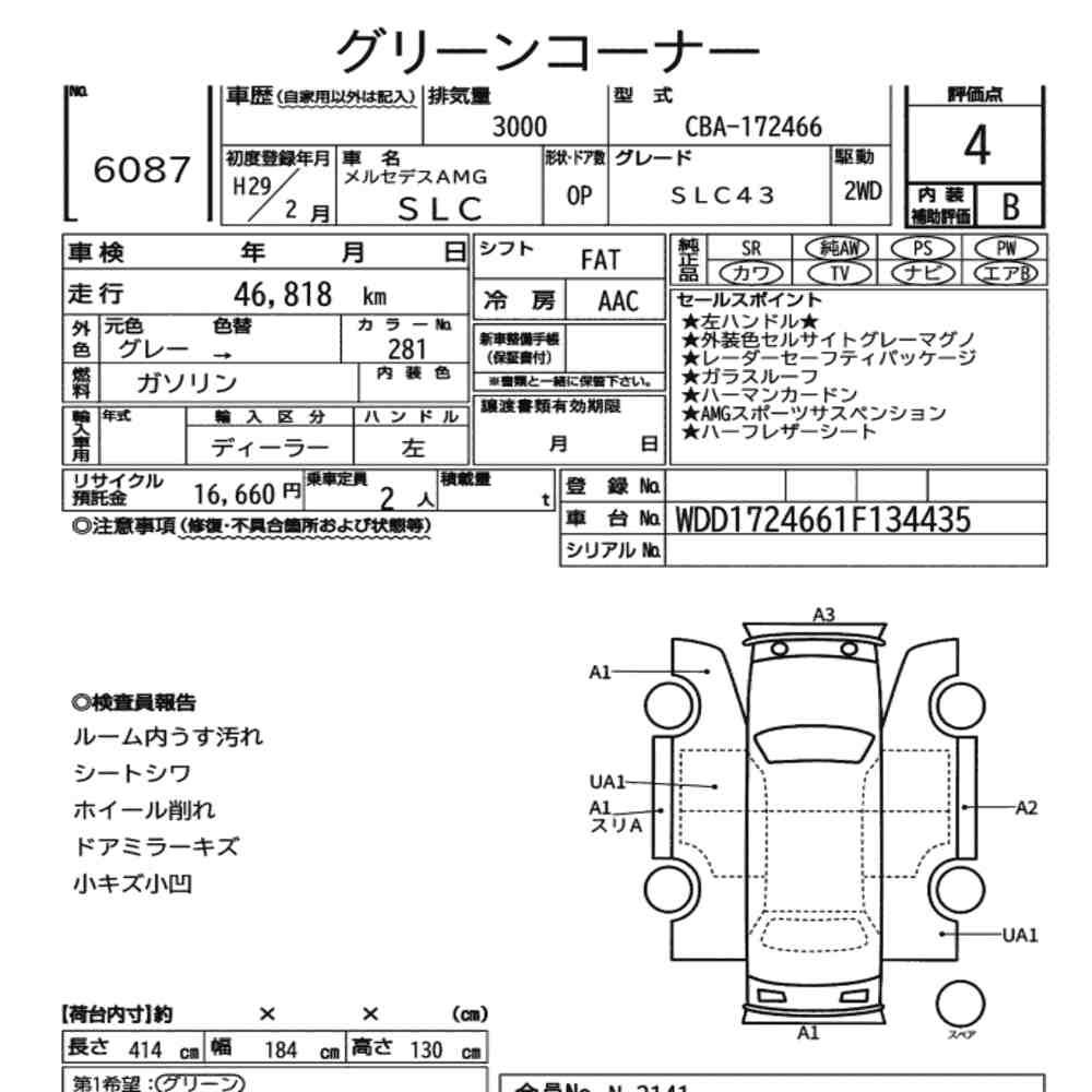 Szczegółowa analiza stanu pojazdu przeprowadzona przez japońskich ekspertów. Sprawdź oznaczenia uszkodzeń poniżej.