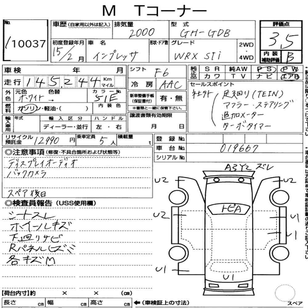 Szczegółowa analiza stanu pojazdu przeprowadzona przez japońskich ekspertów. Sprawdź oznaczenia uszkodzeń poniżej.