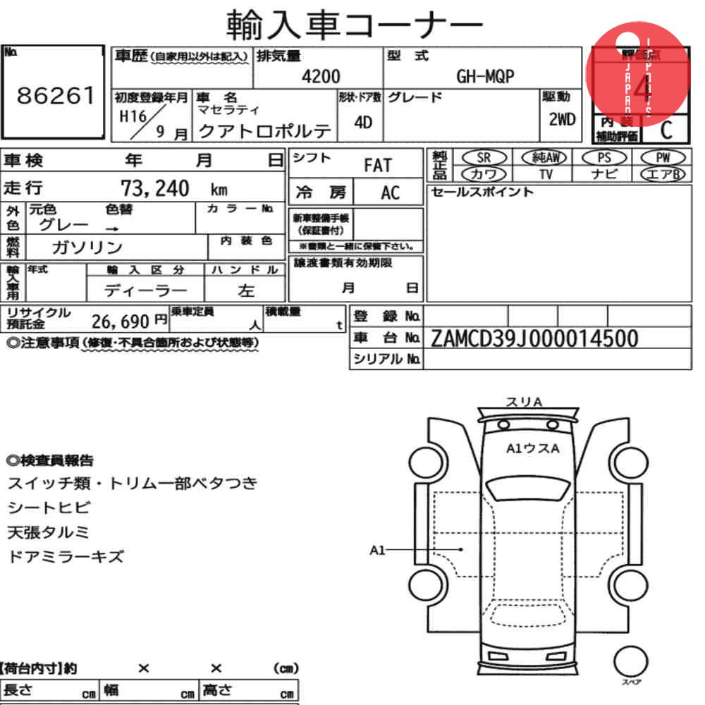 Detailed vehicle condition analysis performed by Japanese experts. Check damage codes below.