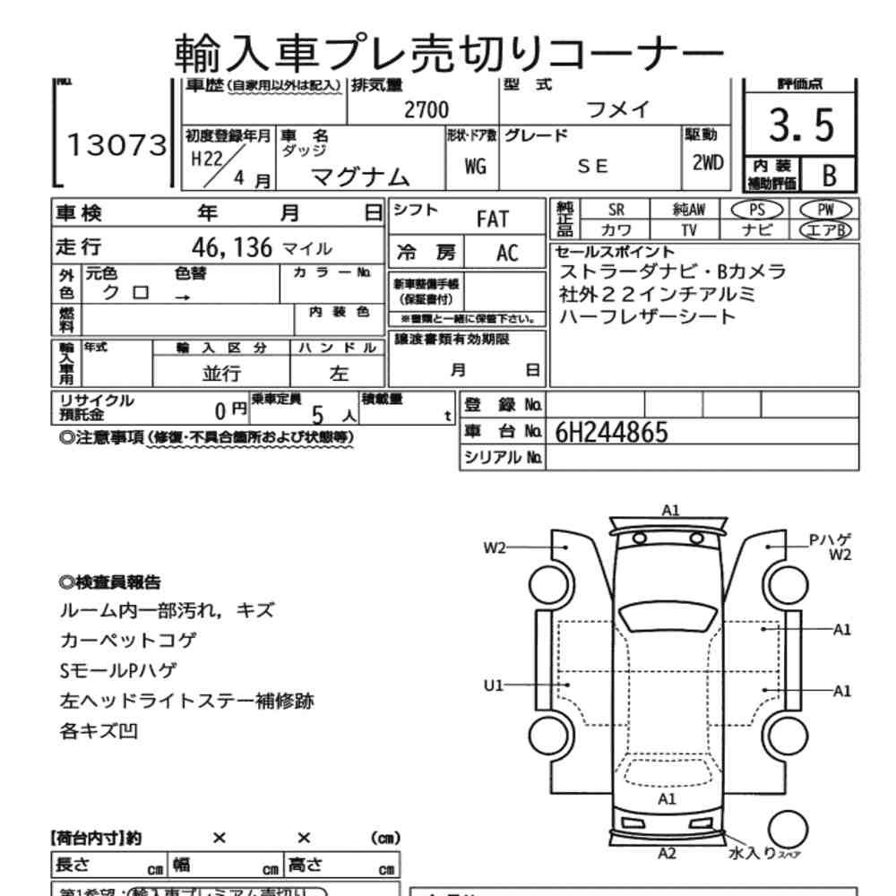Szczegółowa analiza stanu pojazdu przeprowadzona przez japońskich ekspertów. Sprawdź oznaczenia uszkodzeń poniżej.