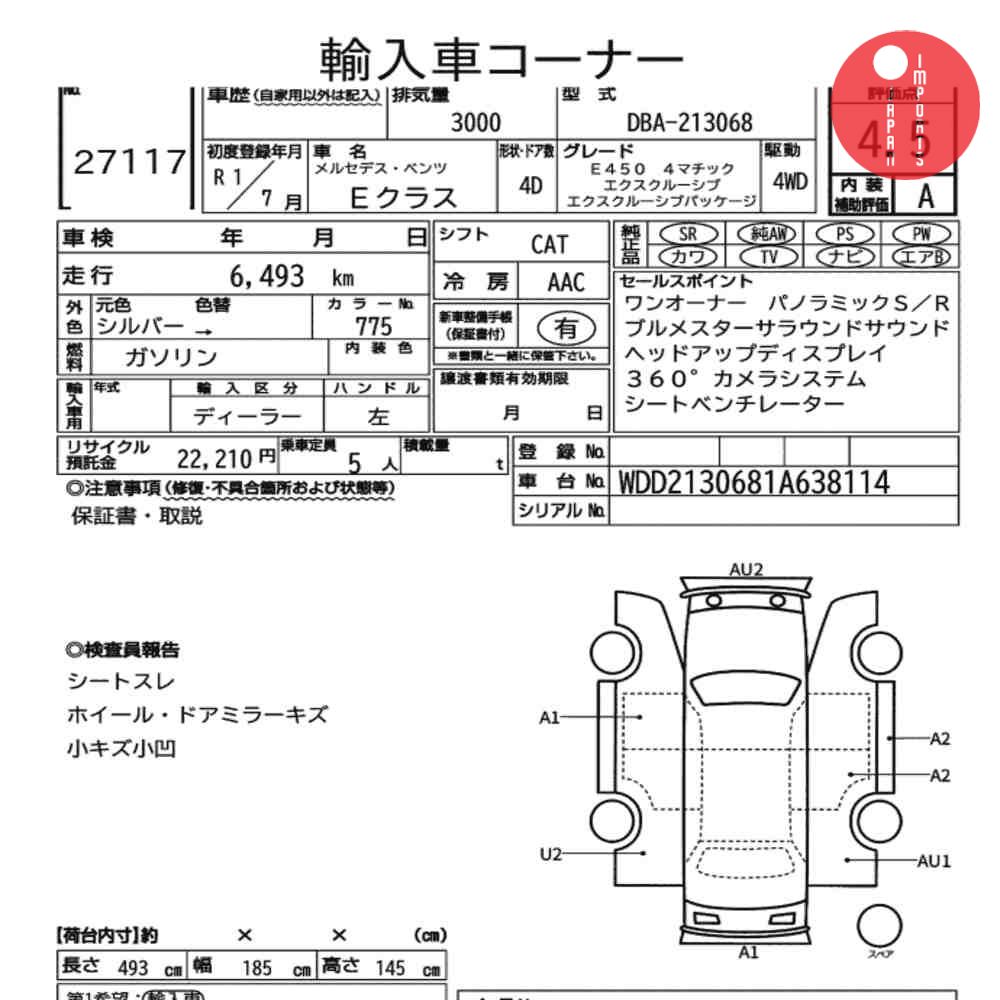 Detailed vehicle condition analysis performed by Japanese experts. Check damage codes below.