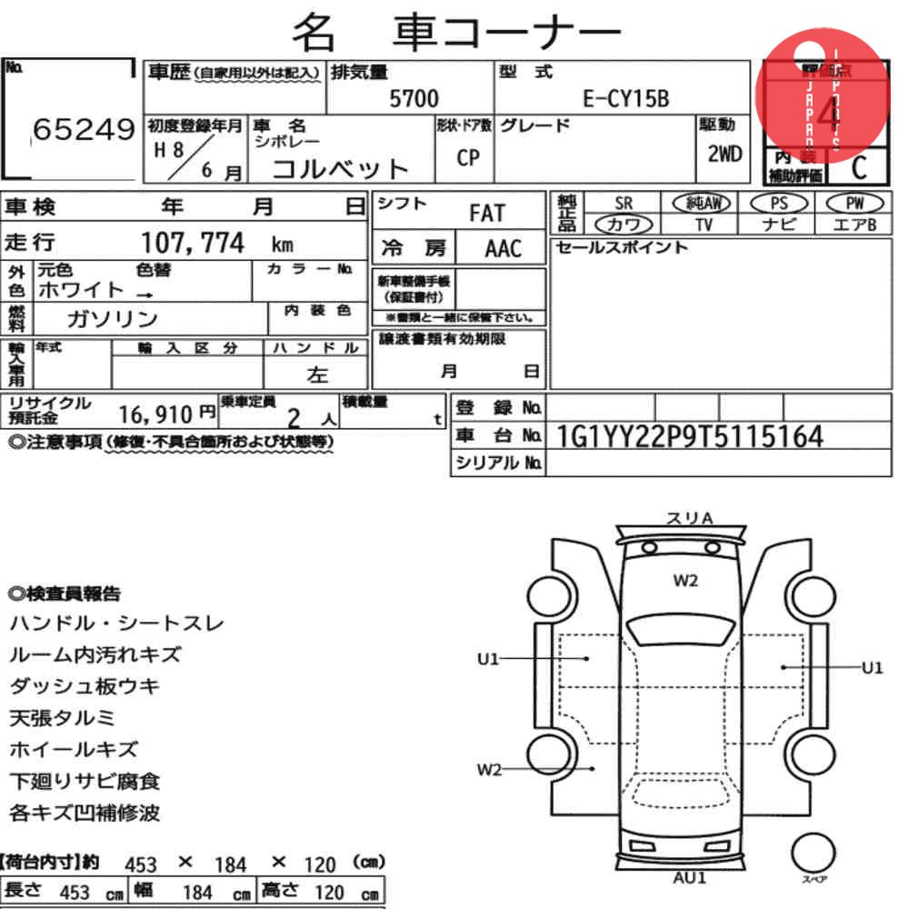Detailed vehicle condition analysis performed by Japanese experts. Check damage codes below.