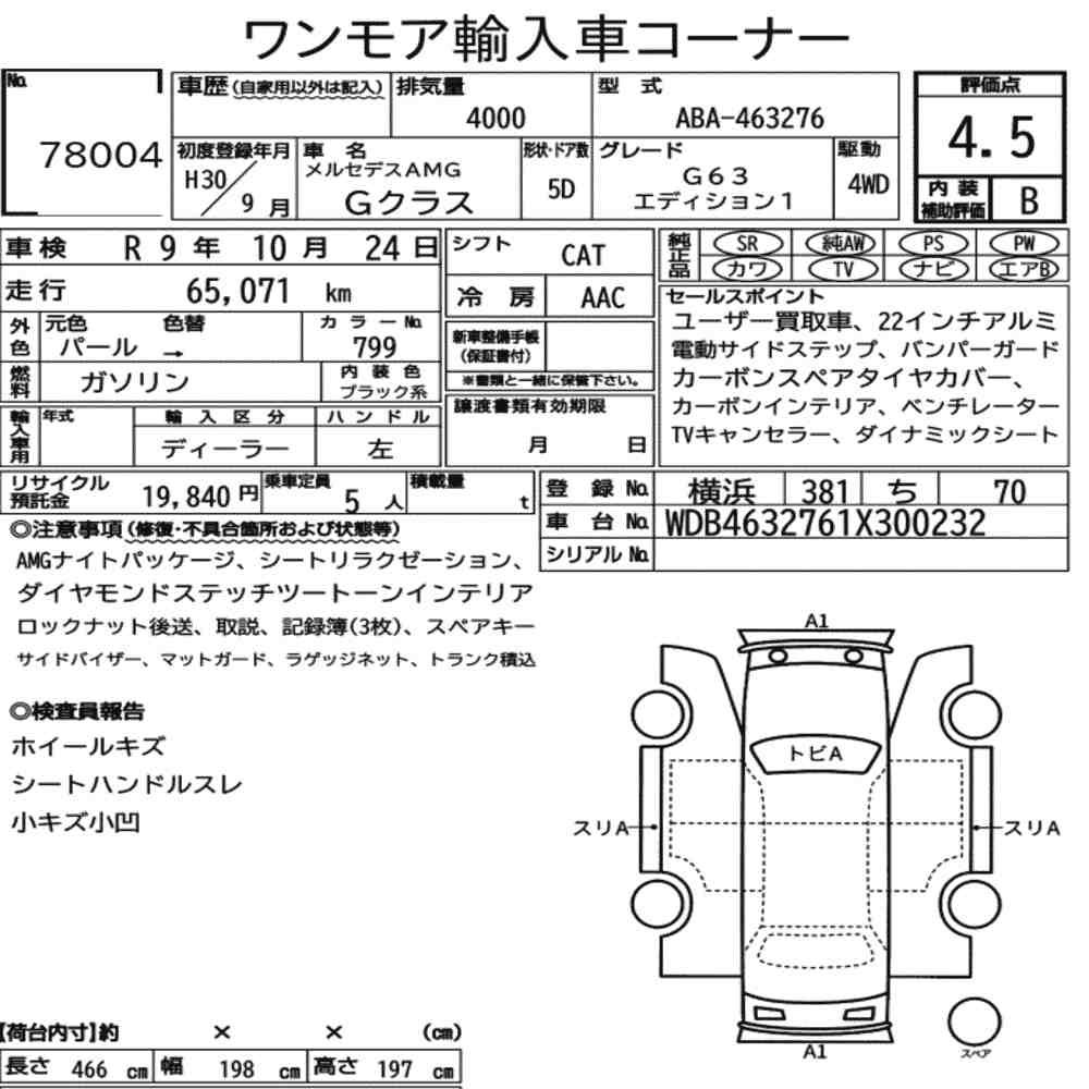 Szczegółowa analiza stanu pojazdu przeprowadzona przez japońskich ekspertów. Sprawdź oznaczenia uszkodzeń poniżej.