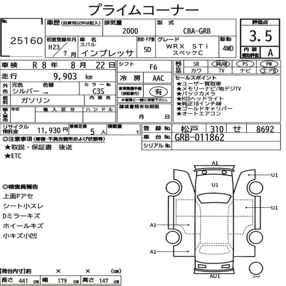 Szczegółowa analiza stanu pojazdu przeprowadzona przez japońskich ekspertów. Sprawdź oznaczenia uszkodzeń poniżej.