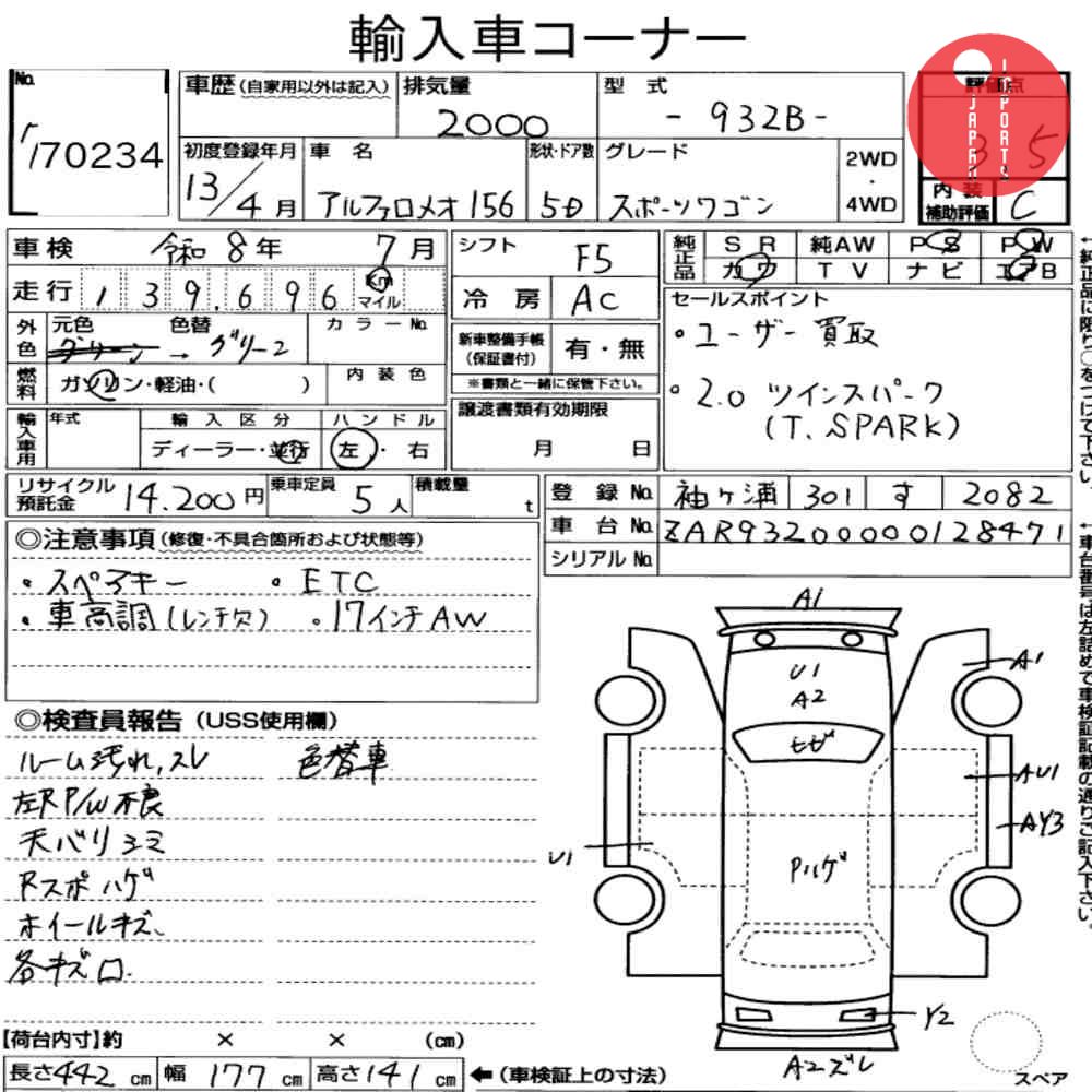 Detailed vehicle condition analysis performed by Japanese experts. Check damage codes below.