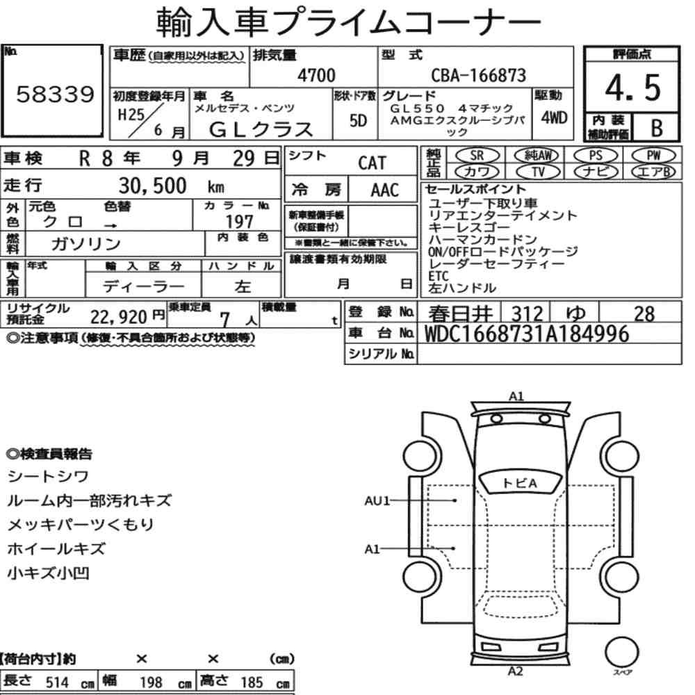 Szczegółowa analiza stanu pojazdu przeprowadzona przez japońskich ekspertów. Sprawdź oznaczenia uszkodzeń poniżej.