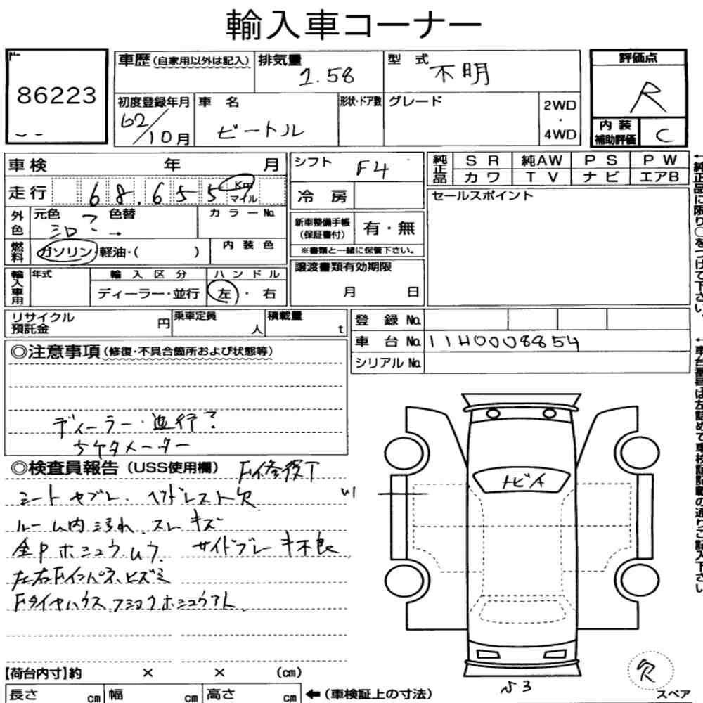 Szczegółowa analiza stanu pojazdu przeprowadzona przez japońskich ekspertów. Sprawdź oznaczenia uszkodzeń poniżej.