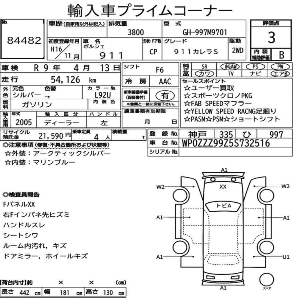 Szczegółowa analiza stanu pojazdu przeprowadzona przez japońskich ekspertów. Sprawdź oznaczenia uszkodzeń poniżej.