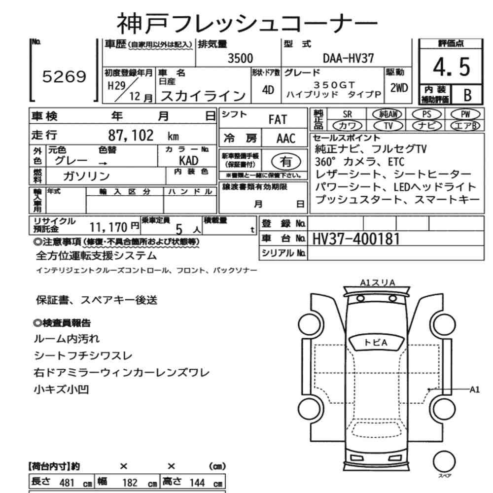 Szczegółowa analiza stanu pojazdu przeprowadzona przez japońskich ekspertów. Sprawdź oznaczenia uszkodzeń poniżej.