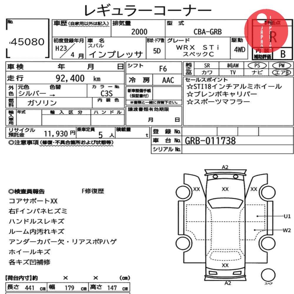Detailed vehicle condition analysis performed by Japanese experts. Check damage codes below.