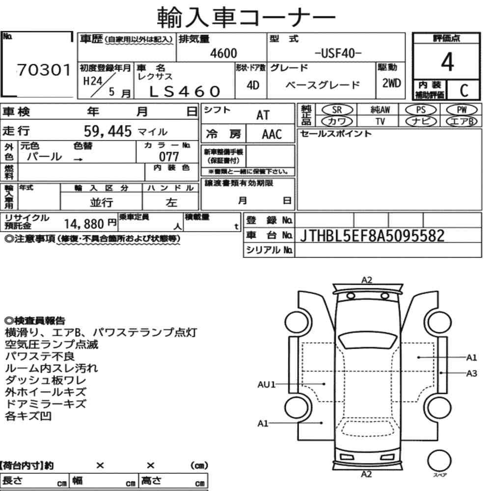 Szczegółowa analiza stanu pojazdu przeprowadzona przez japońskich ekspertów. Sprawdź oznaczenia uszkodzeń poniżej.