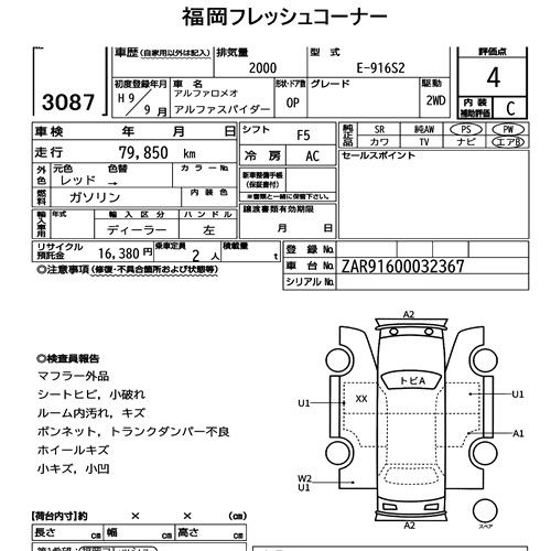 Szczegółowa analiza stanu pojazdu przeprowadzona przez japońskich ekspertów. Sprawdź oznaczenia uszkodzeń poniżej.