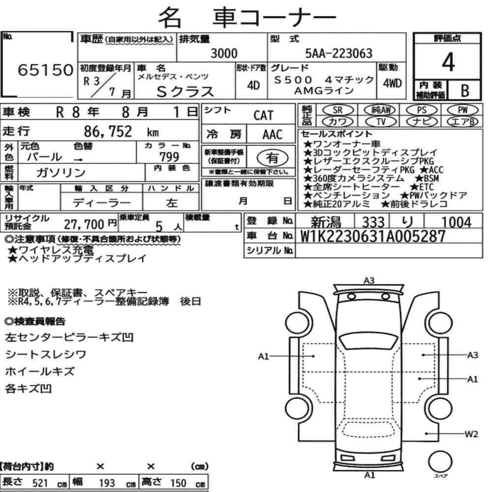 Szczegółowa analiza stanu pojazdu przeprowadzona przez japońskich ekspertów. Sprawdź oznaczenia uszkodzeń poniżej.