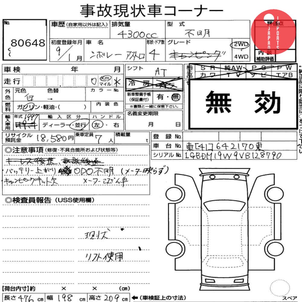 Detailed vehicle condition analysis performed by Japanese experts. Check damage codes below.