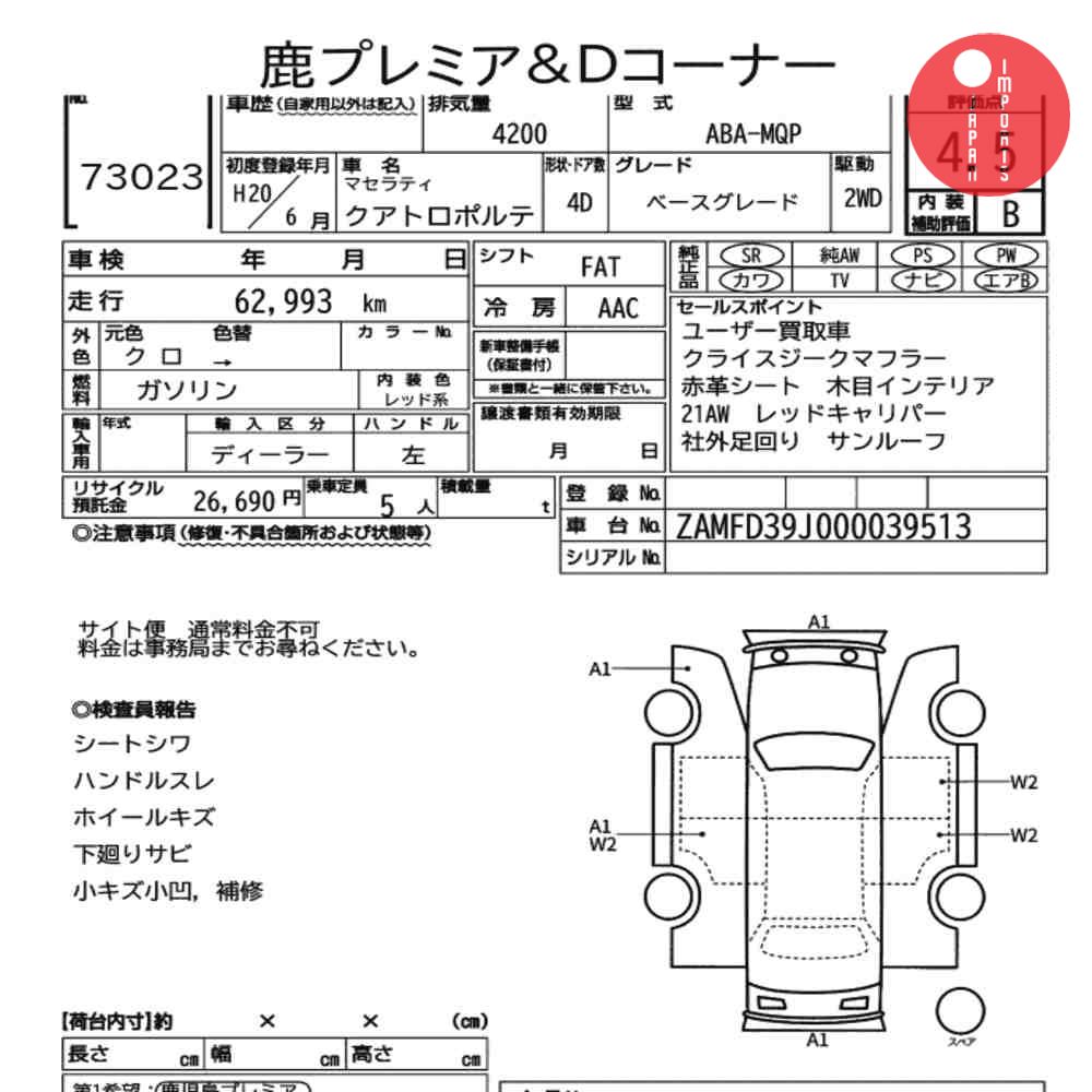 Detailed vehicle condition analysis performed by Japanese experts. Check damage codes below.