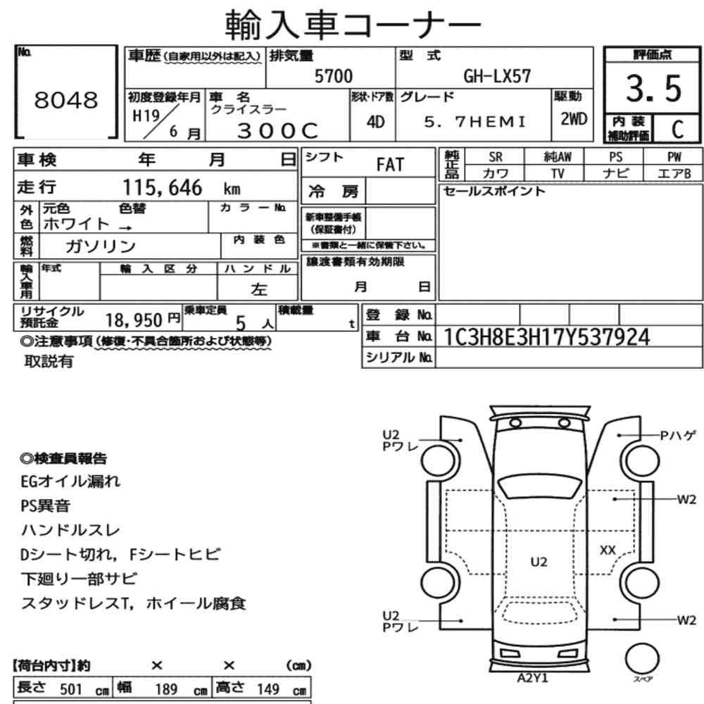 Szczegółowa analiza stanu pojazdu przeprowadzona przez japońskich ekspertów. Sprawdź oznaczenia uszkodzeń poniżej.