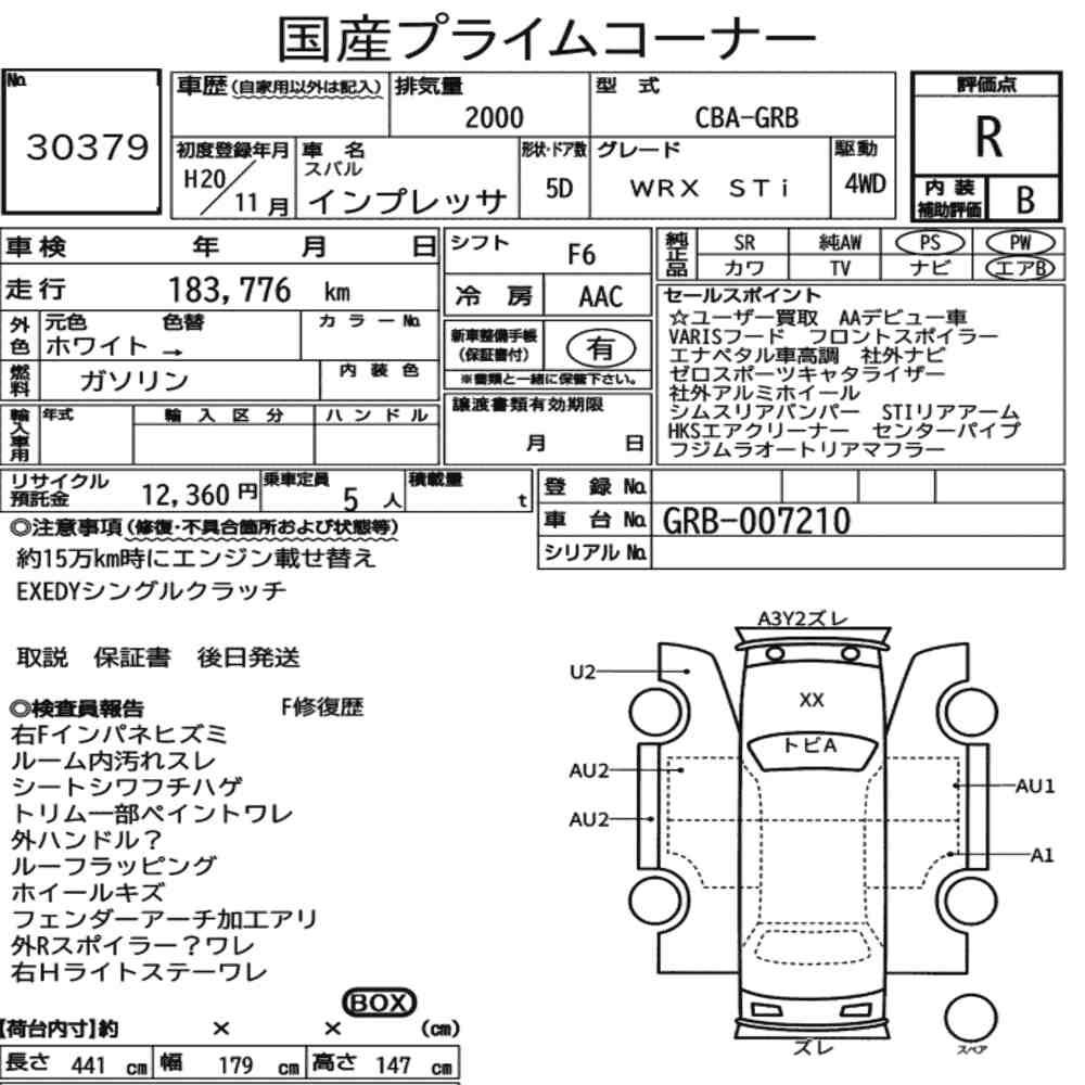 Szczegółowa analiza stanu pojazdu przeprowadzona przez japońskich ekspertów. Sprawdź oznaczenia uszkodzeń poniżej.