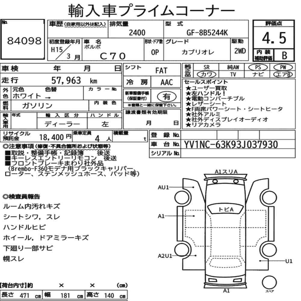 Szczegółowa analiza stanu pojazdu przeprowadzona przez japońskich ekspertów. Sprawdź oznaczenia uszkodzeń poniżej.