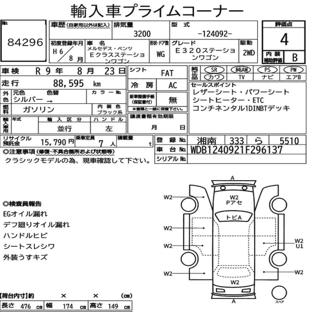 Szczegółowa analiza stanu pojazdu przeprowadzona przez japońskich ekspertów. Sprawdź oznaczenia uszkodzeń poniżej.