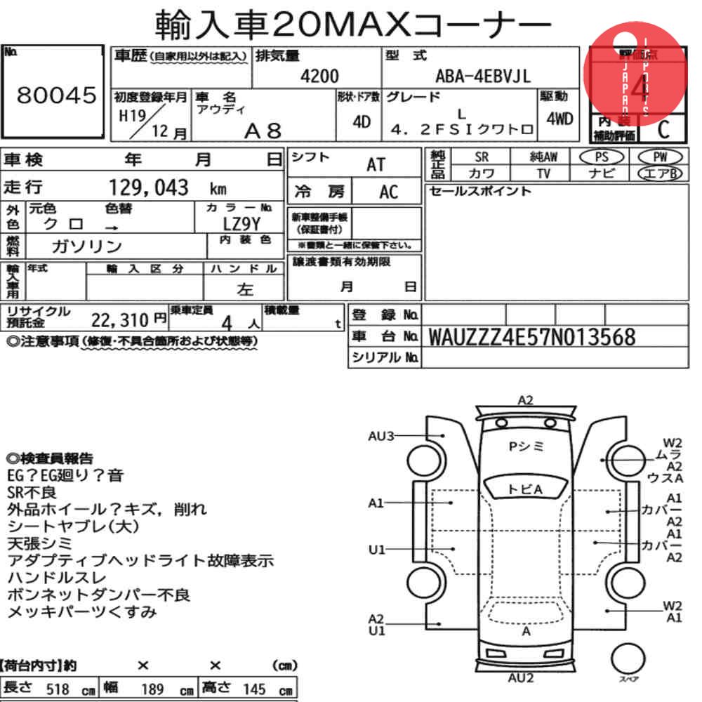 Detailed vehicle condition analysis performed by Japanese experts. Check damage codes below.
