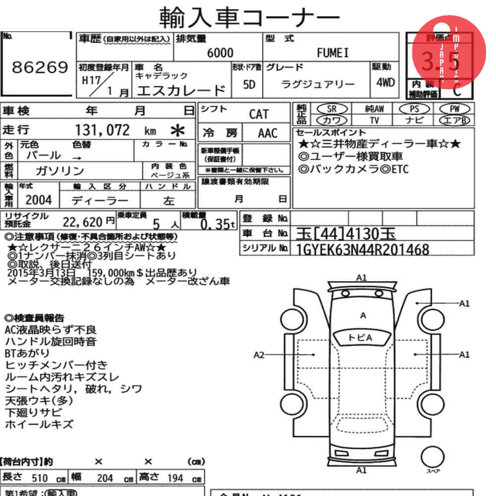 Detailed vehicle condition analysis performed by Japanese experts. Check damage codes below.
