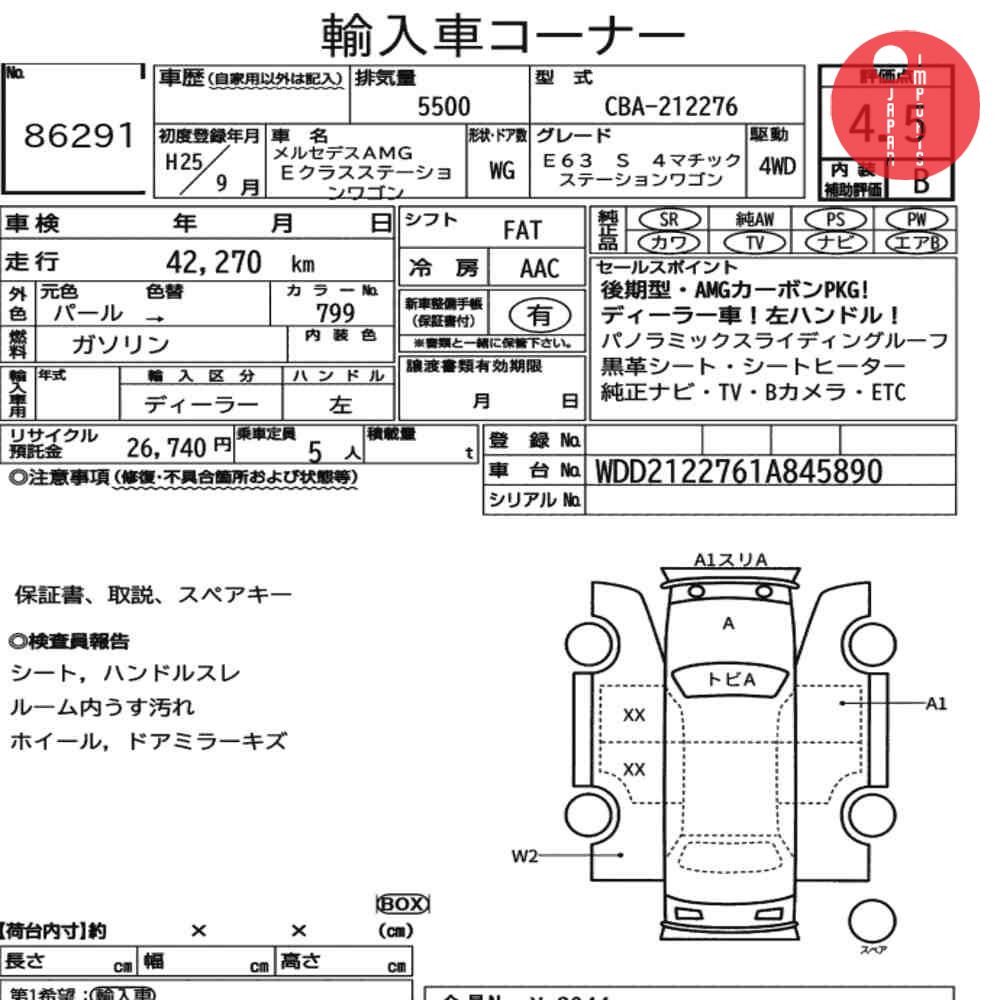 Detailed vehicle condition analysis performed by Japanese experts. Check damage codes below.
