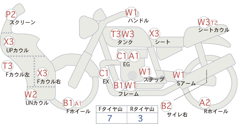 Detailed vehicle condition analysis performed by Japanese experts. Check damage codes below.