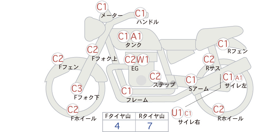 Detailed vehicle condition analysis performed by Japanese experts. Check damage codes below.