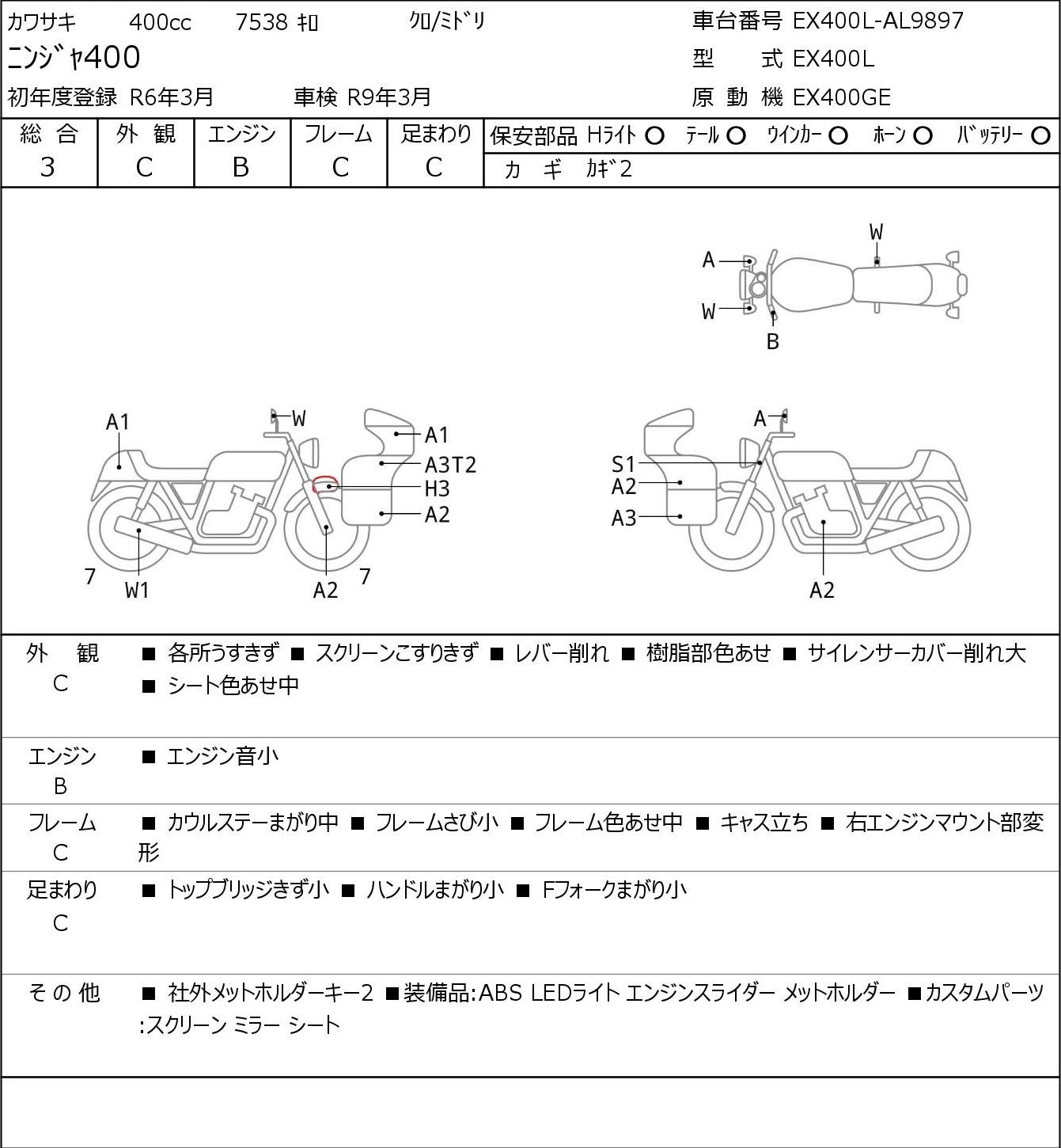Detailed vehicle condition analysis performed by Japanese experts. Check damage codes below.