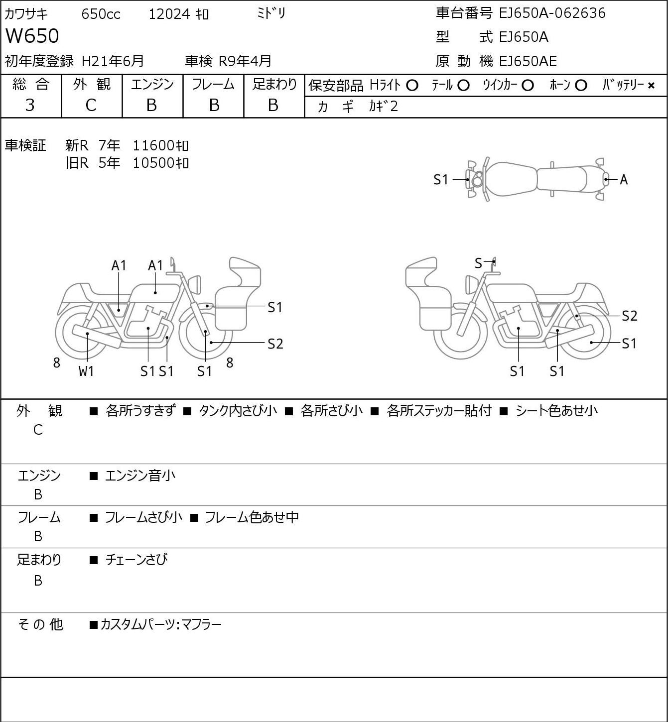Detailed vehicle condition analysis performed by Japanese experts. Check damage codes below.