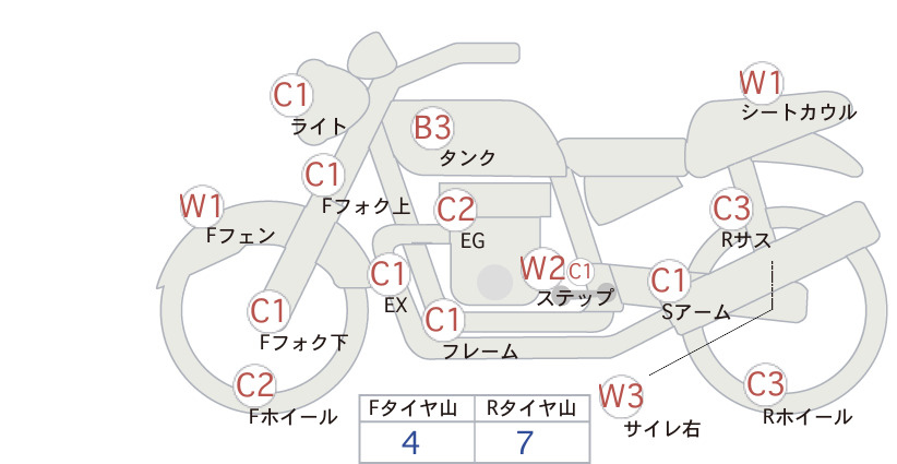 Detailed vehicle condition analysis performed by Japanese experts. Check damage codes below.