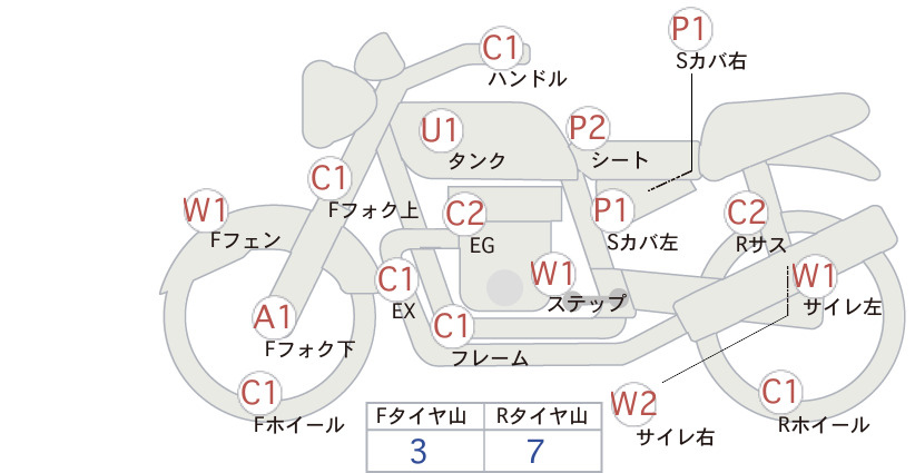 Detailed vehicle condition analysis performed by Japanese experts. Check damage codes below.