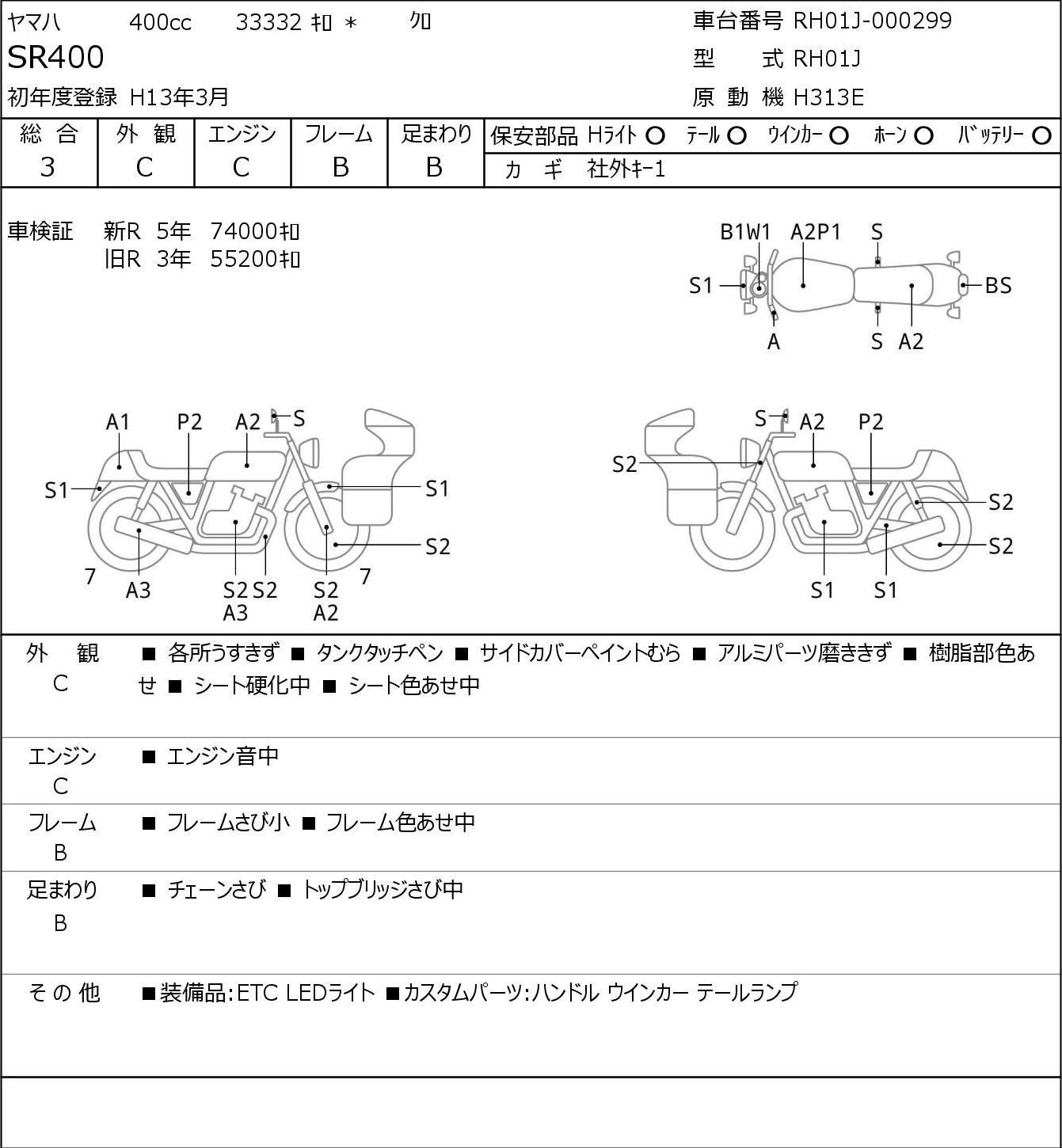 Detailed vehicle condition analysis performed by Japanese experts. Check damage codes below.