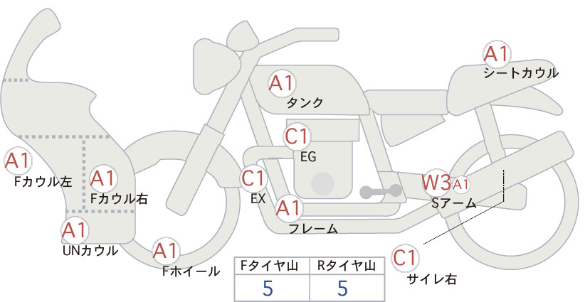 Detailed vehicle condition analysis performed by Japanese experts. Check damage codes below.
