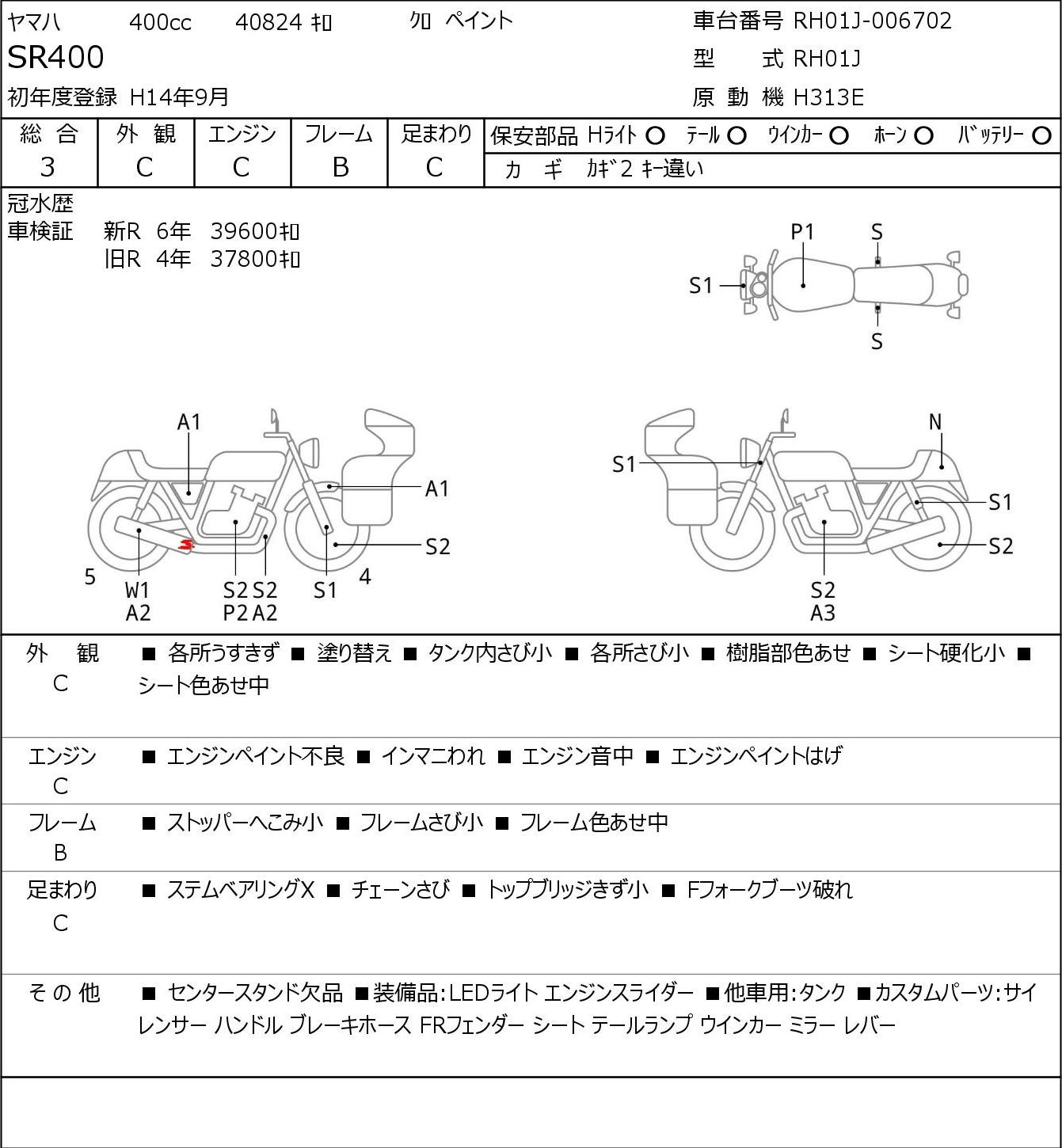 Detailed vehicle condition analysis performed by Japanese experts. Check damage codes below.