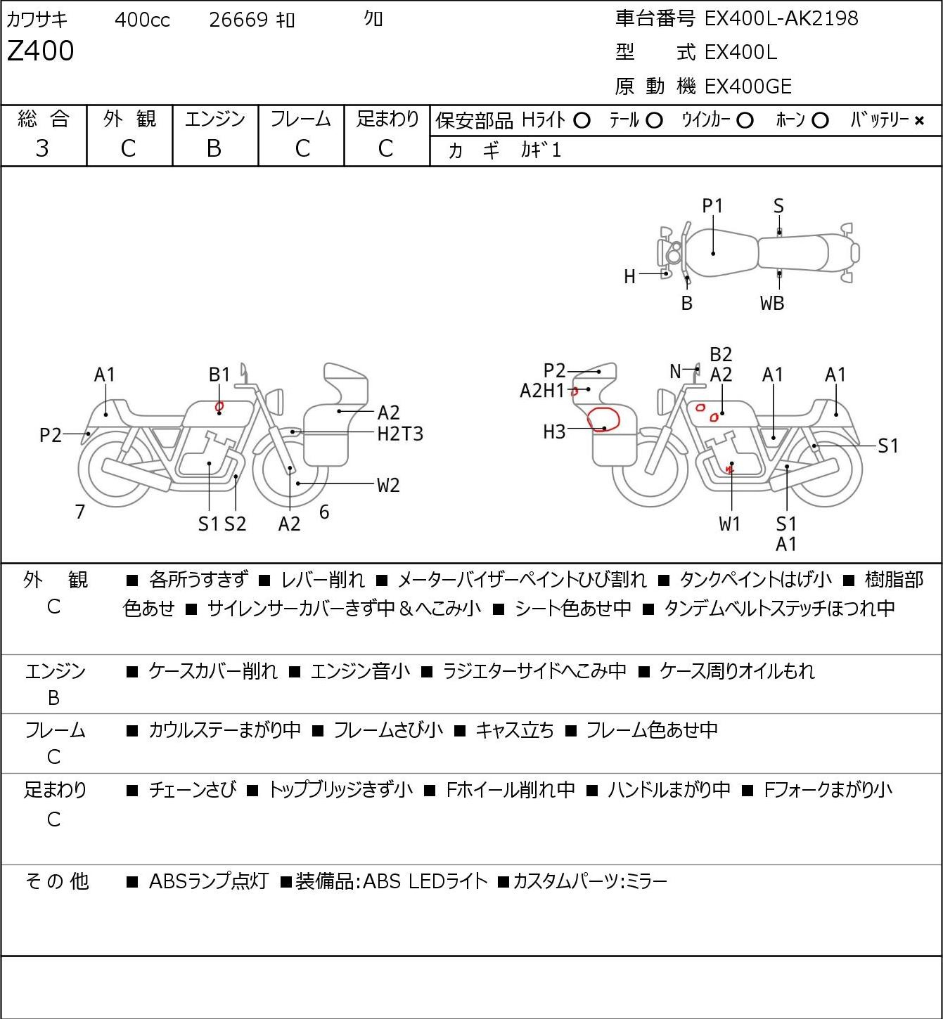 Detailed vehicle condition analysis performed by Japanese experts. Check damage codes below.