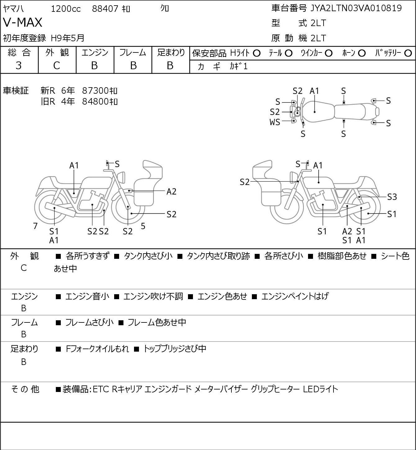 Detailed vehicle condition analysis performed by Japanese experts. Check damage codes below.